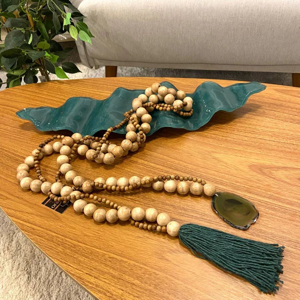 Esse acessório é uma escolha perfeita para quem busca adicionar um toque contemporâneo à decoração, ao mesmo tempo em que traz elementos naturais que conferem autenticidade ao espaço. A fusão dessas características permite que o colar de mesa se adapte perfeitamente tanto a ambientes modernos quanto clássicos, acrescentando um charme especial ao cenário escolhido.